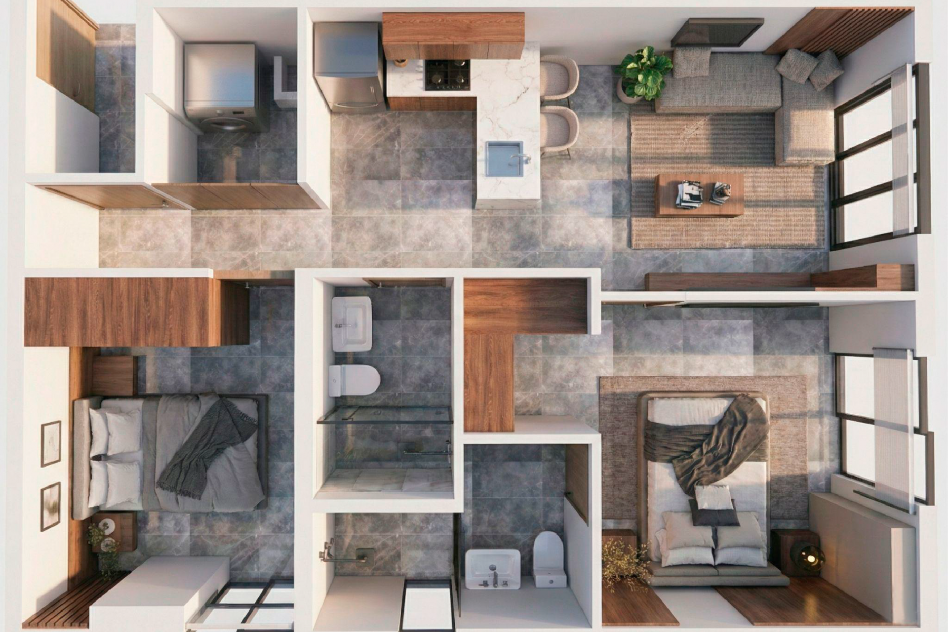 Su distribución inteligente con 2 habitaciones independientes, cada una con baño completo, brinda privacidad, funcionalidad y mayor potencial para distintos esquemas de renta.